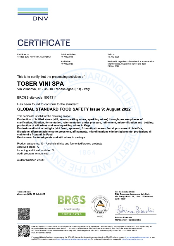 Toser Vini riserva estrema cura e meticolose attenzioni alla qualità a tutto tondo di ogni singolo prodotto lavorato e confezionato nei propri stabilimenti, in funzione di una tangibile garanzia per la variegata platea di consumatori.