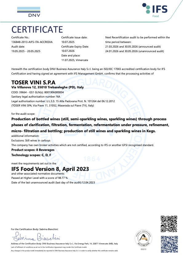 BRC e IFS per il settore food rappresentano due certificazioni chiave in virtù dell’attestazione dell’alto profilo qualitativo acquisito nell’ambito dei nostri ambienti di lavoro, attivato nel nostro processo produttivo, profuso dal nostro personale qualificato e quindi, in buona sostanza, integrato nella nostra gamma vini.